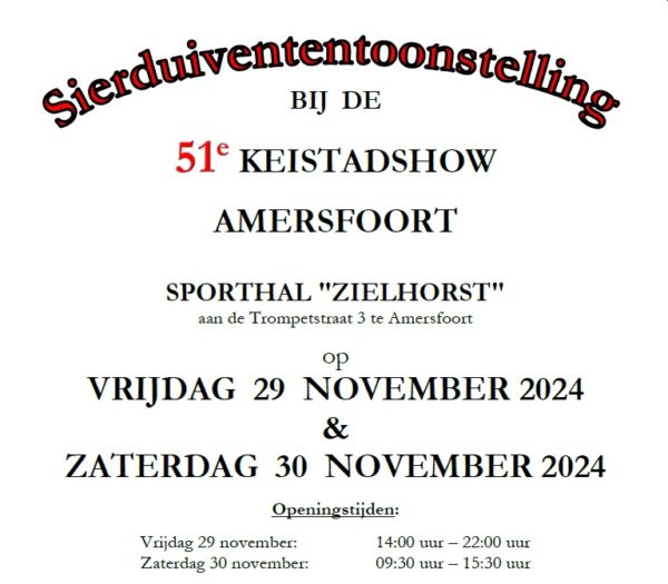 In het laatste weekend van november vindt dan op de Keistadshow onze clubshow plaats. De Keistadshow mag zich verheugen op 1720 ingeschreven sierduiven waarvan 229 Oud Hollandse meeuwen. De Crème de la Crème van onze club zal hier getoond worden, ook voor degenen die geen dieren ingeschreven hebben vallen er dus genoeg fraaie dieren te bewonderen.